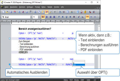 VCmaster 2026 bietet eine effizientes Ein- und Ausblenden von Bereichen. Das können z.B. Berechnungen, Text, Ergebnisausgaben und einzubindende PDF sein.