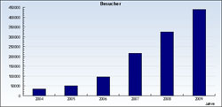 | Unser Unternehmen hat sich auch 2009 -trotz Krise- erfolgreich entwickelt. 2009 verzeichnete unsere Homepage über 440.000 Besucher (siehe Grafik Besucher 2004-2009). Das ist eine Steigerung um 35% gegenüber dem Vorjahr und von 105% gegenüber 2007. | ||||||||||||||||||||||||||||||||||||||||