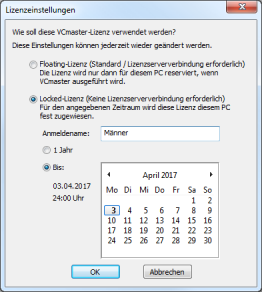 Ist eine Lizenz fest einem Client zugeordnet (locked), kann VCmaster über einen definierten Zeitraum ohne Verbindung zum Lizenzserver genutzt werden. Der Client wählt dazu eine Freischaltung als