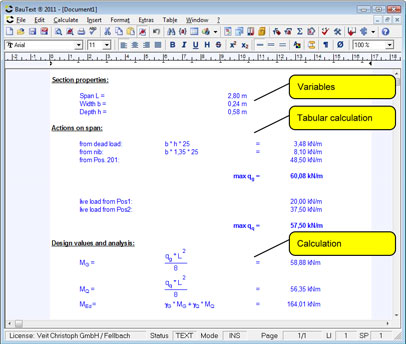 - The input of calculations appears directly in the text program. It is sufficient to write a formula such as M = q * l2 / 8 or τ =Teq