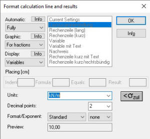 - With numerical values: Either the variables and the numerical values or just the numerical values are displayed. If both are displayed, it is possible to determine whether the formula is displayed on one line or two. The latter is necessary for long formulae.