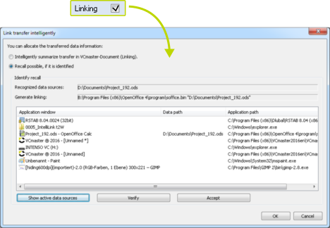 - Transfer as a hybrid object (optional): Links the transferred data with the VCmaster document. This reduces the load on the computer resources. The data is automatically reloaded when required. Note: The technology requires that the file name and storage location of the VCmaster document are known. You will be prompted to save any unnamed documents.