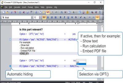 VCmaster 2026 provides efficient showing and hiding of sections. These can include calculations, text, result output and embedded PDF