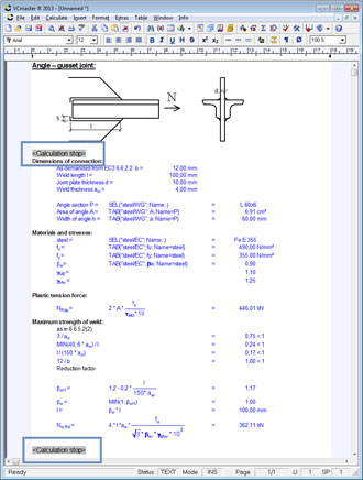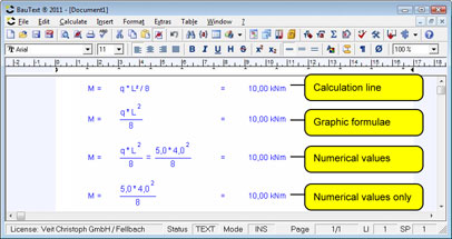 - The input of calculations appears directly in the text program. It is sufficient to write a formula such as M = q * l2 / 8 or τ =Teq