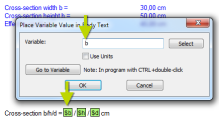 Variable values can be placed freely within the body text with our without units of measurement. This is done by references to variables which are displayed in green (see image).