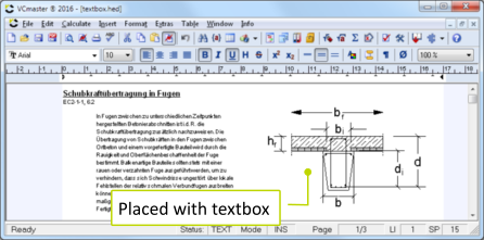 External graphics can be embedded and placed within the document by utilizing certain text boxes. These graphics can be, for example, detailed drawings created with and managed by an external program.