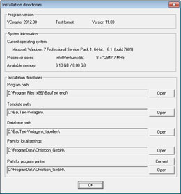 We recommend specifying different directories for the program, the templates and the data. For work groups, templates and data can be stored on network hard drives.