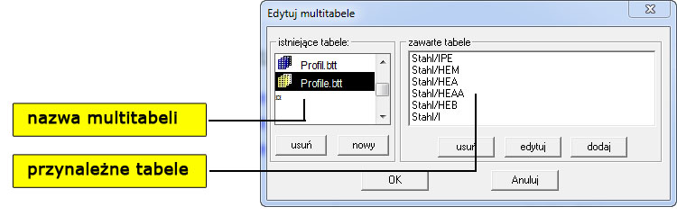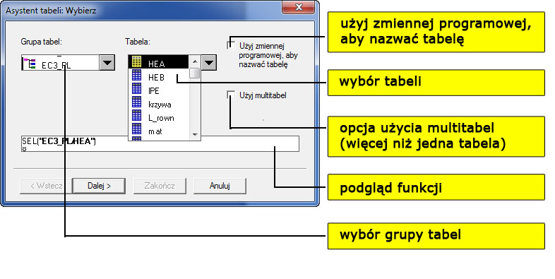 | Multitabele to inaczej grupy tabel. Kwerendy odnoszą się wówczas nie do jednej tabeli, lecz do wszystkich tabel należących do danej grupy. Ma to uzasadnienie, jeśli przykładowo podobne elementy konstrukcji inżynierskiej znajdują się w kliku bazach danych (tabelach, np. profile stalowe). Kwerenda odbywa się tylko w połączeniu z funkcją SEL(). Kolejny warunek polega na tym, że wszystkie oznaczenia zmiennych użyte w tabelach należących do danej grupy muszą być identyczne. Aby edytować i zarządzać multitabelami, należy wybrać opcję Oblicz - Asystent funkcji SEL. |