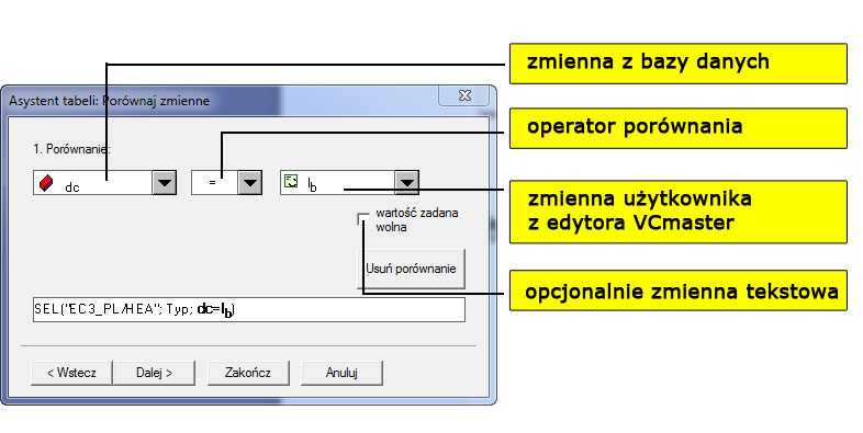 | Dzięki użyciu zmiennych kwerenda może być bardzo elastyczna. W powyższym przykładzie wystarczy zmienić “HEA" na “HEB", żeby program VCmaster znalazł wymagany profil w szeregu HEB. |