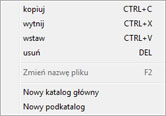 | Ponadto przeglądarka szablonów służy do zarządzania plikami szablonów. W tym celu należy prawym przyciskiem myszy wywołać odpowiednie menu kontekstowe (rysunek z prawej). | ||||||||||