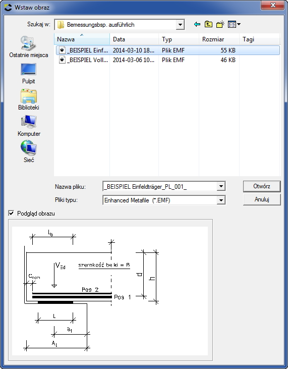 | Przed wstawieniem dowolnego pliku graficznego można zobaczyć jego podgląd. Należy sprawdzić ustawienia żądanego formatu. Chcąc wstawić np. bitmapę, jako typ pliku należy wybrać „Windows Bitmap“. |