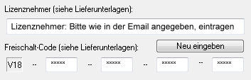 Bitte geben Sie Lizenznehmer und Code exakt ein (siehe Email):